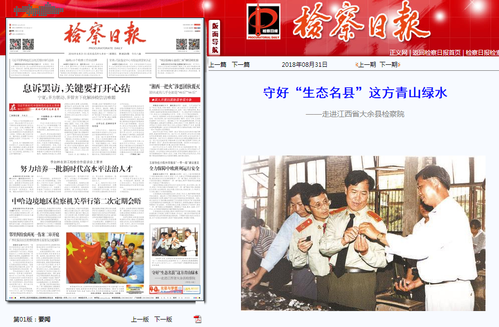 2018年8月31日,《检察日报》第01版:要闻刊发了《守好“生态名县”这方青山绿水——走进江西省大余县检察院》一文,全文具体如下: